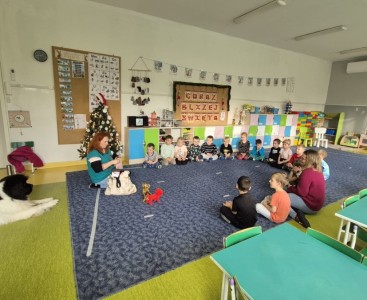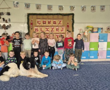 Dzisiaj grupę Zajączków odwiedził wyjątkowy gość – pies Janek wraz ze swoją opiekunką, Panią Kasią. Podczas spotkania dzieci poznały zasady bezpiecznego kontaktu z psem: dowiedziały się, jak prawidłowo go pogłaskać, w których miejscach lubi dotyk, a których należy unikać. Przedszkolaki miały również okazję nakarmić Janka. Zajęcia odbyły się w ramach projektu „Przedszkolak dziś, dorosły jutro”.
