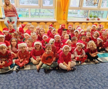 Żabki w oczekiwaniu na Świętego Mikołaja przygotowały swoje czerwone stroje oraz nauczyły się piosenki "Dzyń, dzyń, dzyń Mikołaju Święty". Razem z innymi grupami powitaliśmy go w sali grupy Sówek. Gość specjalny odwiedził nas później w naszej sali i rozdał nam piękne prezenty.