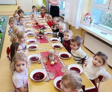 W dniu przedszkolnej wigilii panowała radosna i pełna ciepła atmosfera. Ten szczególny dzień rozpoczął się koncertem „Pana Orkiestry”, który poprzedził świąteczny obiad. Pięknie udekorowane sale oraz dzieci ubrane w galowe stroje wprowadzały wszystkich w świąteczny nastrój. Przed obiadem wspólnie składaliśmy sobie życzenia.
