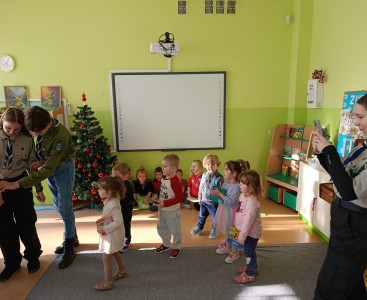 Harcerze w ciepłej i serdecznej atmosferze przekazali płomień pokoju, zachęcając wszystkich do dzielenia się dobrem, życzliwością i wzajemnym szacunkiem. Spotkanie było dla przedszkolaków wyjątkową lekcją wartości, takich jak pomoc, empatia i odpowiedzialność za drugiego człowieka. Bardzo Dziękujemy Harcerzom za wizytę
