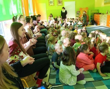 W dniu dzisiejszym wszystkie przedszkolaki wspólnie kolędowały i śpiewały piosenki świąteczne, tworząc radosną, pełną ciepła i uśmiechu atmosferę. Dzieci z ogromnym zaangażowaniem włączyły się we wspólne muzykowanie, chętnie śpiewając znane kolędy i piosenki bożonarodzeniowe.
