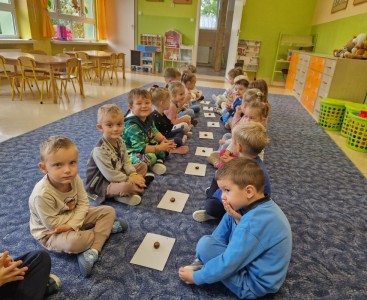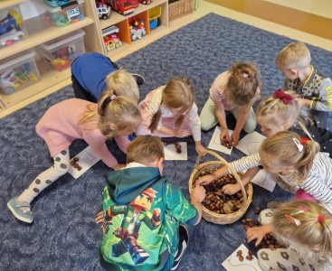 Dziś w grupie Sówek dzień pełen aktywności. Dzieci bawiły się kasztanami- grały na kasztanach muzykę, układały mozaiki